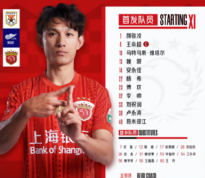 1-颜骏凌、22-杨希、13-魏震、40-吾米提江、32-李帅、4-王燊超、23-傅欢、38-卢永涛、10-维塔尔、14-安永佳、33-刘祝润。武磊和刘若钒替补席待命,海港队最大的问题还是上班,加布里埃尔与蒋光太全都是无法参赛。