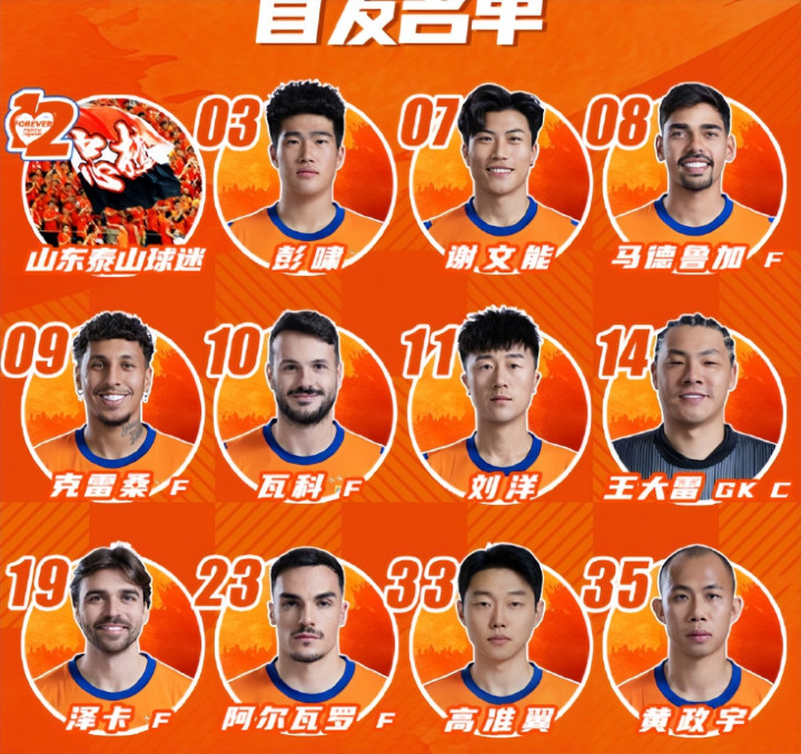 山东泰山首发:14-王大雷、11-刘洋、3-彭啸、23-佩德罗-阿尔瓦罗、33-高准翼、35-黄政宇、8-马德鲁加、7-谢文能、9-克雷桑、10-卡扎伊什维利、19-泽卡。伤员刘洋与克雷桑首发,刘彬彬和李源一替补。
